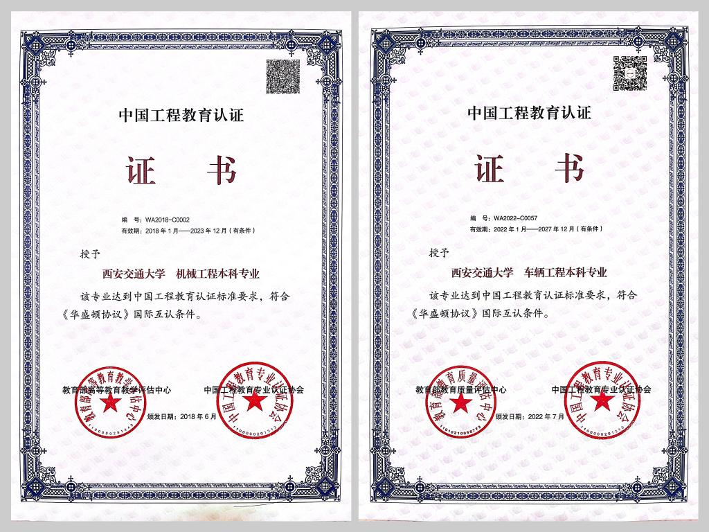 机械工程专业、车辆工程专业认证证书